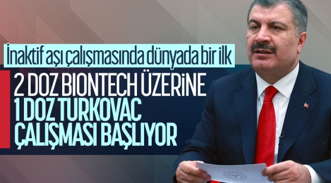 Bakan Koca, "2 doz BioNTech aşısı üzerine 1 doz Turkovac aşısı çalışmasını başlatacağız. mRNA üzeri inaktif aşı çalışması dünyada ilk olacak" dedi.