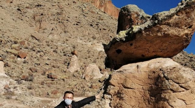 "Bunlardan en ilginci arkamda bulunan halk arasında 'çarıklı kaya' dediğimiz çarığa benzeyen peribacamız. Burası anayola yakın olduğu için yoldan geçen insanların dikkatini çekiyor" dedi.