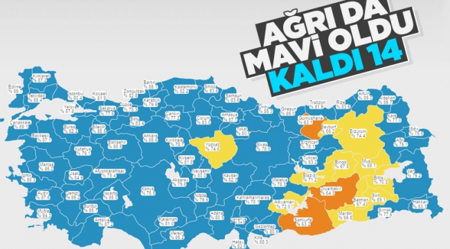 Sağlık Bakanı Fahrettin Koca, Ağrı ilinin yüzde 75'in üzerine çıkan ilk doz aşı oranıyla maviye döndüğünü, turuncu ve sarı risk grubunda sadece 14 ilin kaldığını açıkladı.