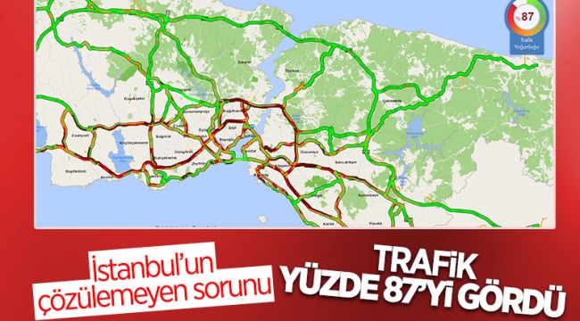 İstanbul'da yağışın da etkisiyle trafik yoğunluğunun daha da arttığı gözlendi. İBB'nin trafik haritasına göre yoğunluk yüzde 87 olarak ölçüldü.