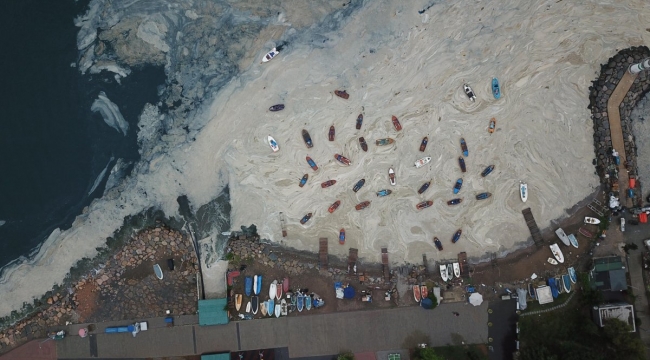 Sahilde tekneleri çevreleyen müsilaj, drone ile havadan görüntülendi.