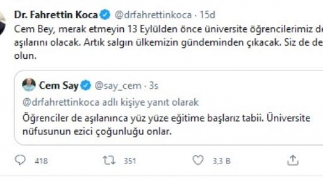 Bakan Koca, Say'ın eleştirisine yanıt vererek, "Cem Bey, merak etmeyin 13 Eylül'den önce üniversite öğrencilerimiz de aşılarını olacak. Artık salgın ülkemizin gündeminden çıkacak. Siz de destek olun." açıklamasını yaptı.