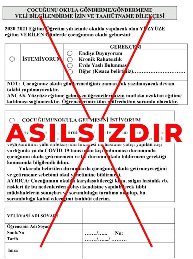 Milli Eğitim Bakanlığının Twitter hesabından, yüz yüze eğitim sürecinde velilerin, çocuklarını okula gönderme veya göndermemeleri durumunda okula sunmaları gerektiği iddia edilen "izin ve taahhütname" dilekçesine ilişkin paylaşımda bulunuldu.