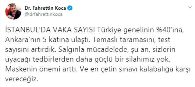Bakan Koca, Twitter hesabından yaptığı paylaşımda, İstanbul'daki vaka sayısının Türkiye genelinin yüzde 40'ına, Ankara'nın 5 katına ulaştığını belirterek, "Temaslı taramasını, test sayısını artırdık. Salgınla mücadelede, şu an, sizlerin uyacağı tedbirlerden daha güçlü bir silahımız yok. Maskenin önemi arttı. Ve en çetin sınavı kalabalığa karşı vereceğiz" ifadelerini kullandı.