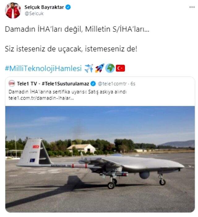 Baykar Teknik Müdürü ve T3 Mütevelli Heyeti Başkanı Selçuk Bayraktar, Tele1 TV'de yer alan "Damadın İHA'larına sertifika uyarısı: Satış askıya alındı" başlıklı haberdeki, TB2 İHA motorlarının askeri kullanım sertifikasına sahip olmadığına ilişkin iddiaya sosyal medya hesabından yaptığı paylaşımla yanıt verdi.