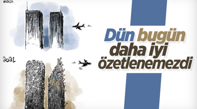 Çizimde Dünya Ticaret Merkezi olan ikiz kulelere gelen bir uçak ve 2021 yılında Afganlardan oluşan kulelerin üstünden geçen uçak yer aldı.