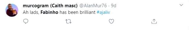 Fabinho'nun bu müdahalesi sosyal medyada gündem oldu. İngiliz taraftarlar Brezilyalı futbolcunun performansına duyduğu hayranlığı belirtti. Bir futbolsever, "Şu anda hangi pozisyon Fabinho çünkü onu tam anlamıyla şu anda kesinlikle her şey ve her yerde görüyorum. Vay be ne oyuncu" ifadesini kullanırken, bir başkası "Fabinho harika" paylaşımında bulundu.